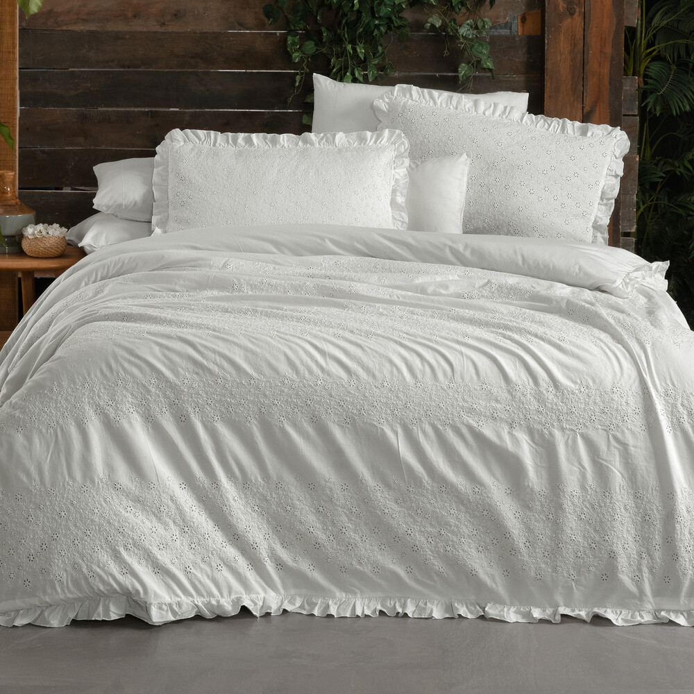 Таблиця розмірівКомплект постільної білизни Sarev зроблений з 100% вареної бавовни з аплікацією і рюшами в стилі прованс. Тканина м’яка, міцна, і приємна до тіла, бавовна найвищої якості. Варена бавовна проходить процес санфоризація – термічної обробки бавовняної тканини, з метою запобігти можливій усадці після прання готового виробу або звести її до мінімуму.