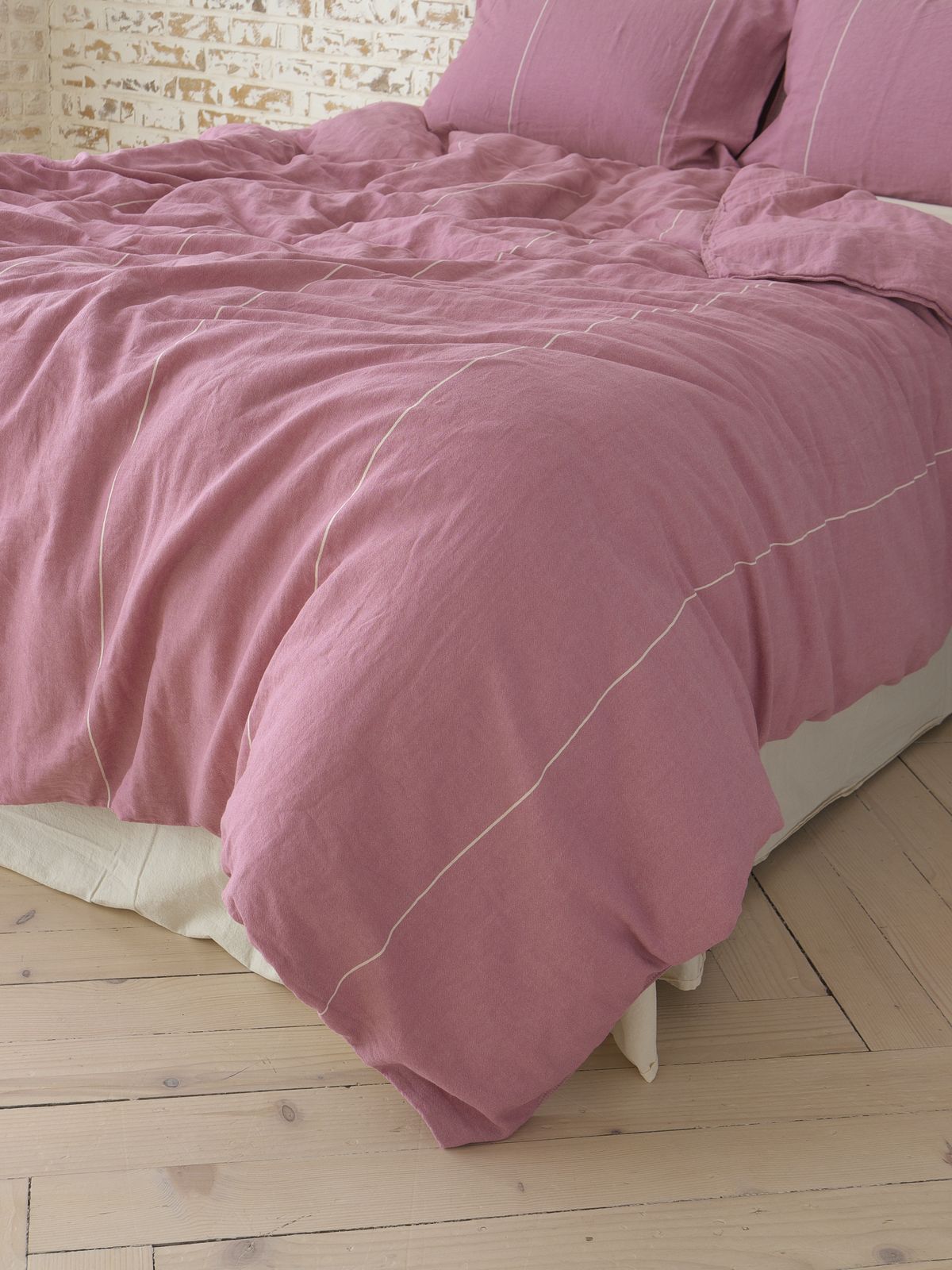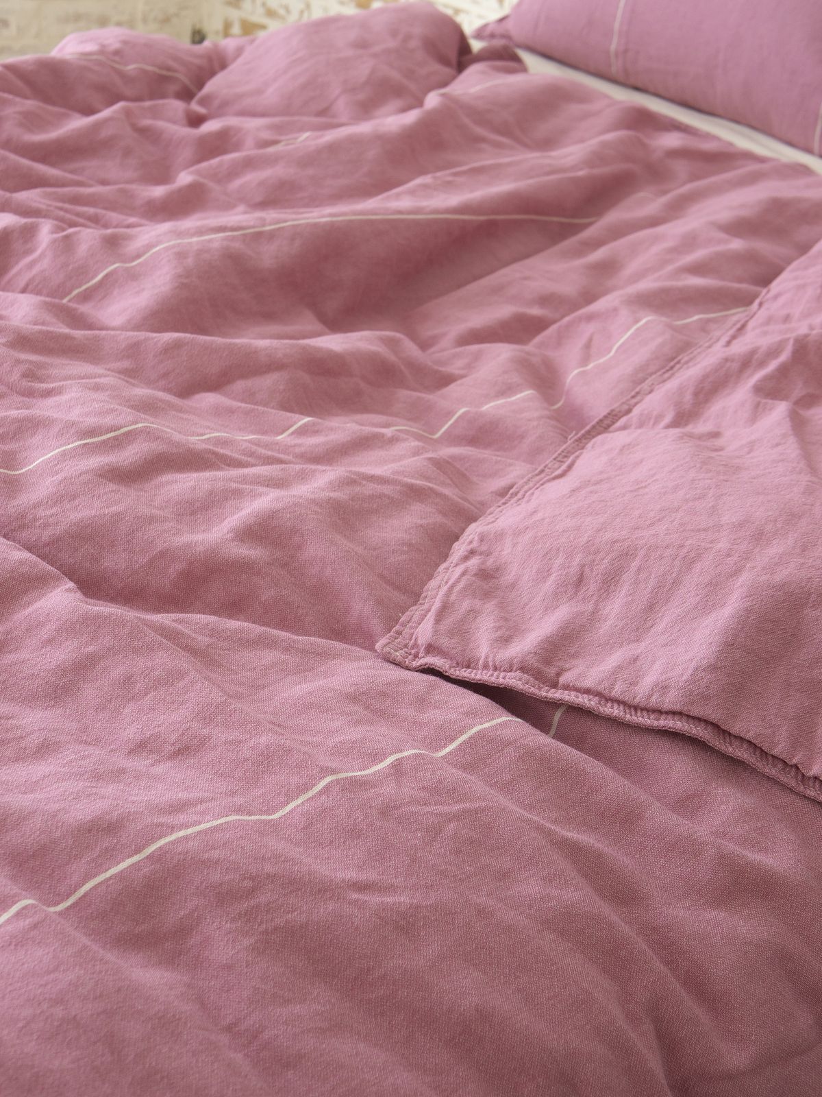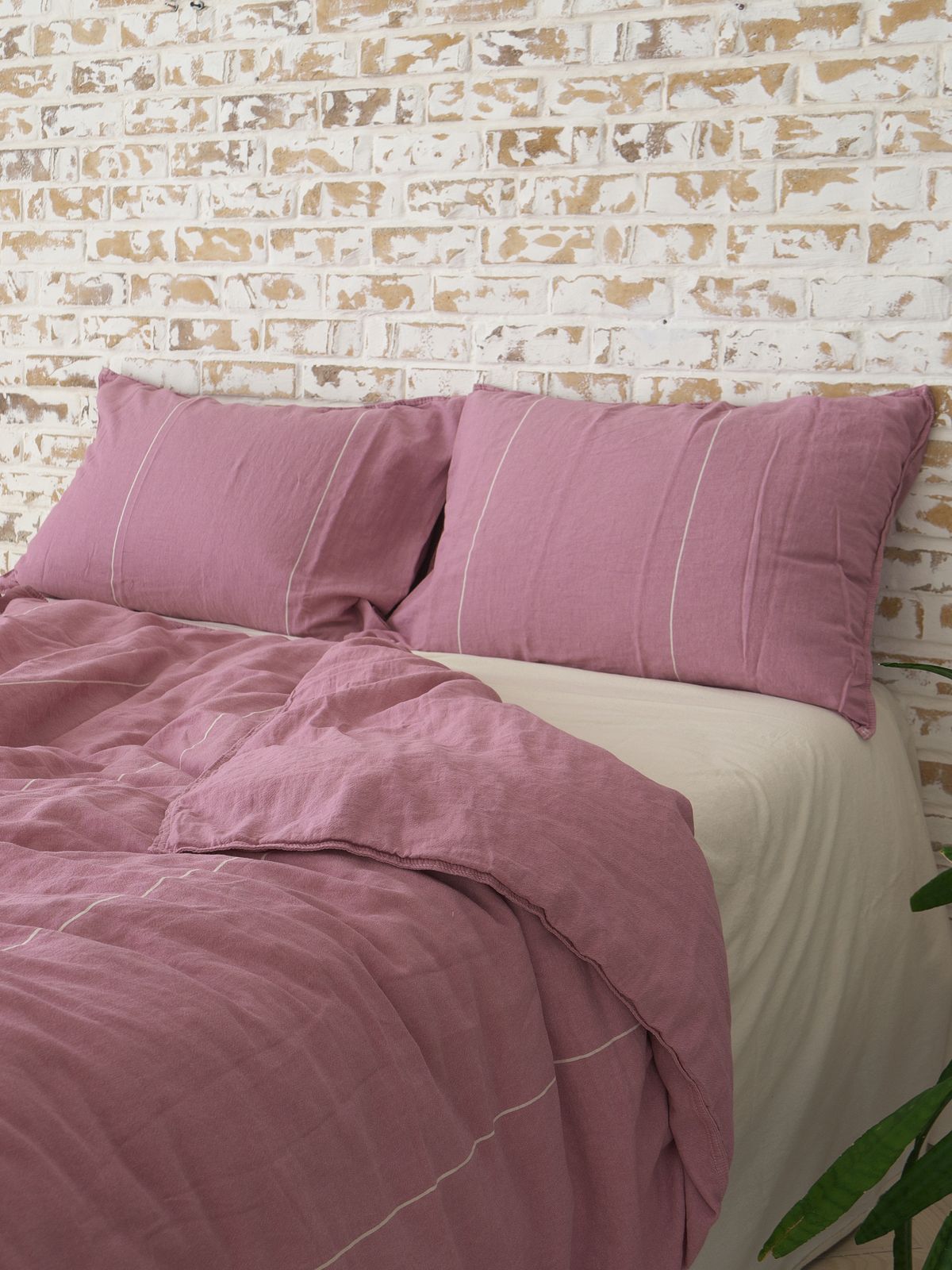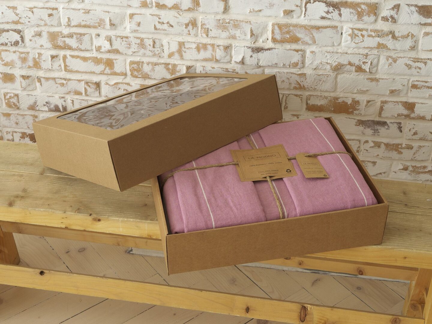Таблиця розмірівПостільна білизна LA MODNO Massimo виготовлена з бавовняної пістрявотканої тканини з додатковою обробкою по технології washed cotton. Тканина на виробництві піддається тепловій та вологій обробці, внаслідок чого відбувається її усадка з придбанням незначного тисненого ефекту. Завдяки такій обробці, постільна білизна дуже мʼяка та ніжна на дотик. Відмінно вбирає вологу, легко пропускає повітрі. Після прання не дає усадки та не потребує прасування. Підковдра та наволочки виготовлені з тканини рожевого кольору зі смужками молочного кольору по довжині полотна. Простирадло – однотонна тканина молочного кольору. Застібка на підковдрі прозорі ґудзики. Для пошиву наволочок і підковдри використовується подвійний шов.
