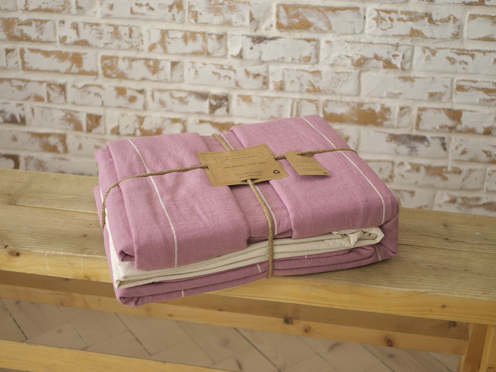 Таблиця розмірівПостільна білизна LA MODNO Massimo виготовлена з бавовняної пістрявотканої тканини з додатковою обробкою по технології washed cotton. Тканина на виробництві піддається тепловій та вологій обробці, внаслідок чого відбувається її усадка з придбанням незначного тисненого ефекту. Завдяки такій обробці, постільна білизна дуже мʼяка та ніжна на дотик. Відмінно вбирає вологу, легко пропускає повітрі. Після прання не дає усадки та не потребує прасування. Підковдра та наволочки виготовлені з тканини рожевого кольору зі смужками молочного кольору по довжині полотна. Простирадло – однотонна тканина молочного кольору. Застібка на підковдрі прозорі ґудзики. Для пошиву наволочок і підковдри використовується подвійний шов.