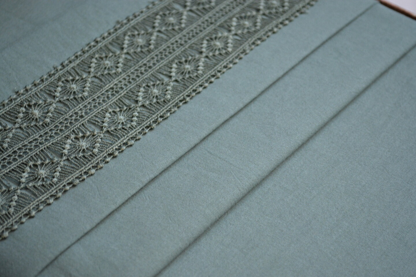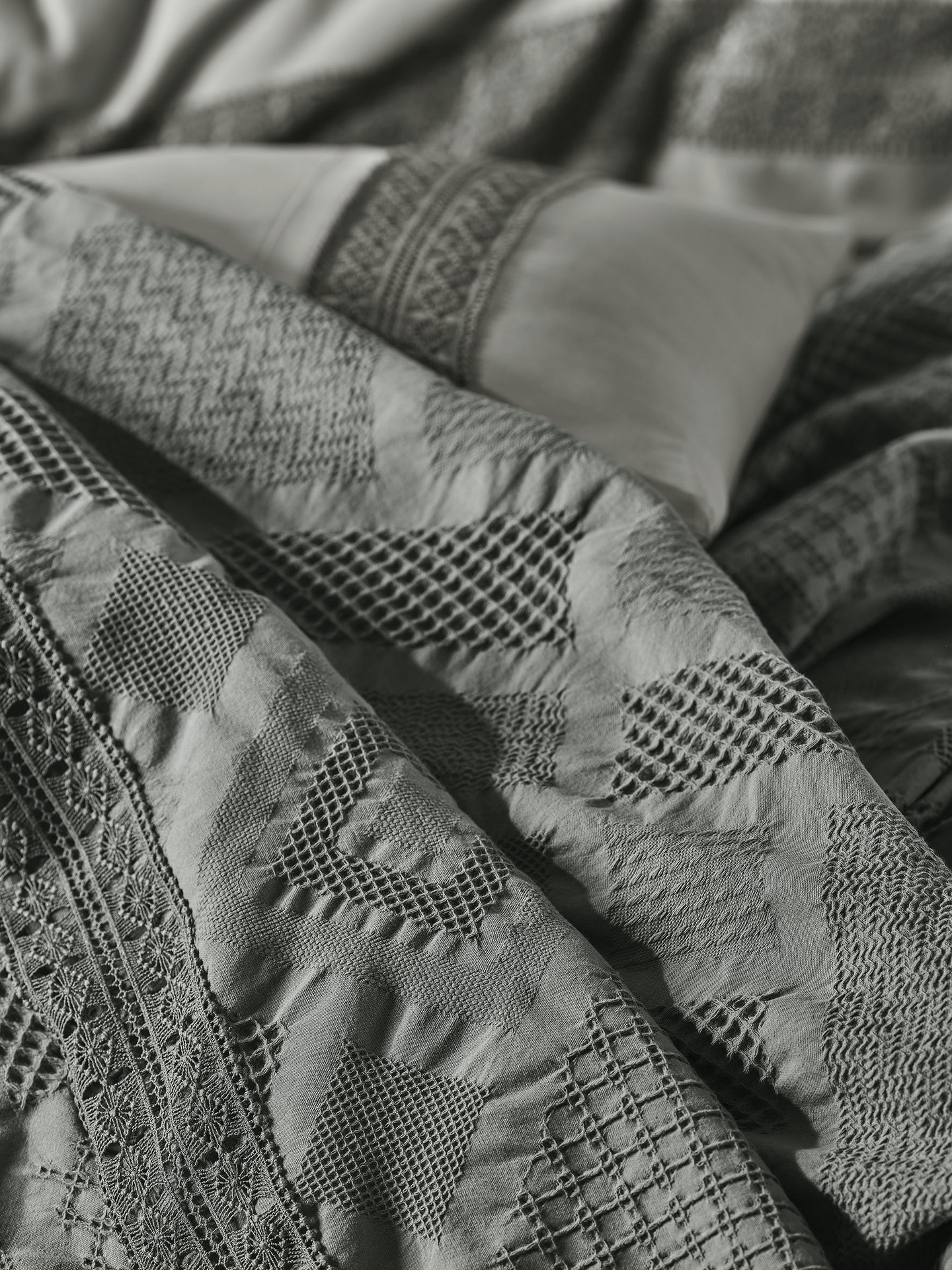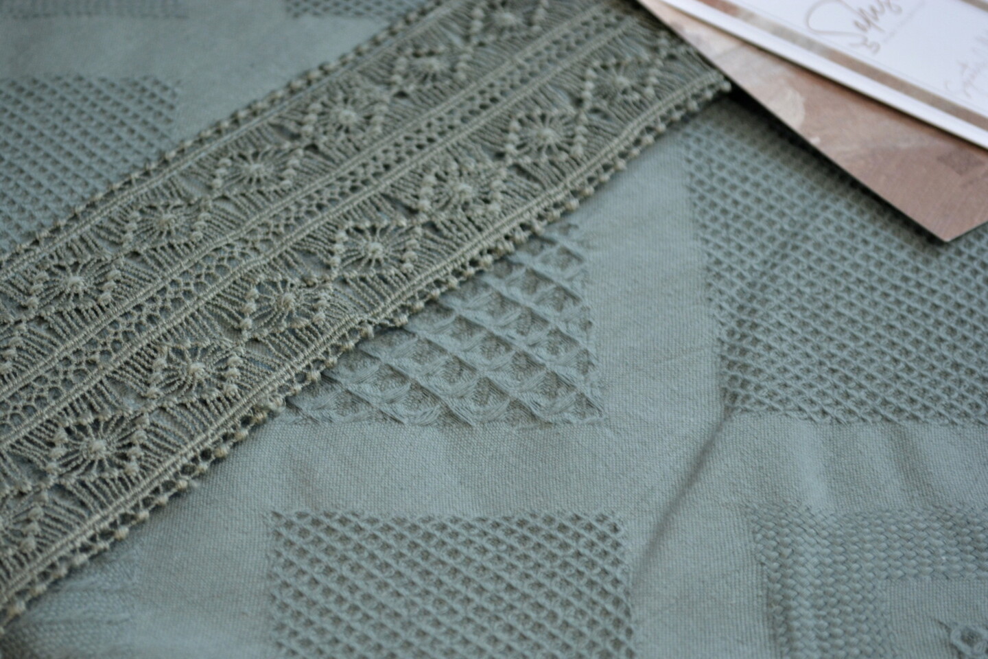 В данному комплекті покривало має вишукане жакардове плетіння. Комплект оздоблений ніжним мереживом.