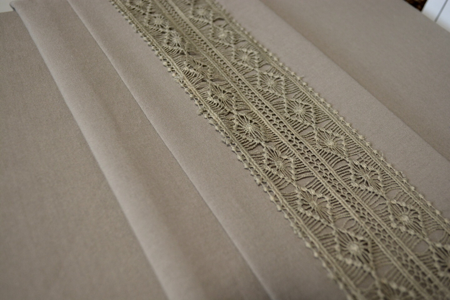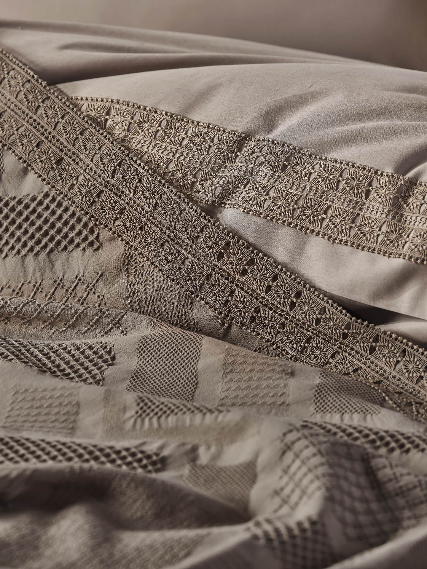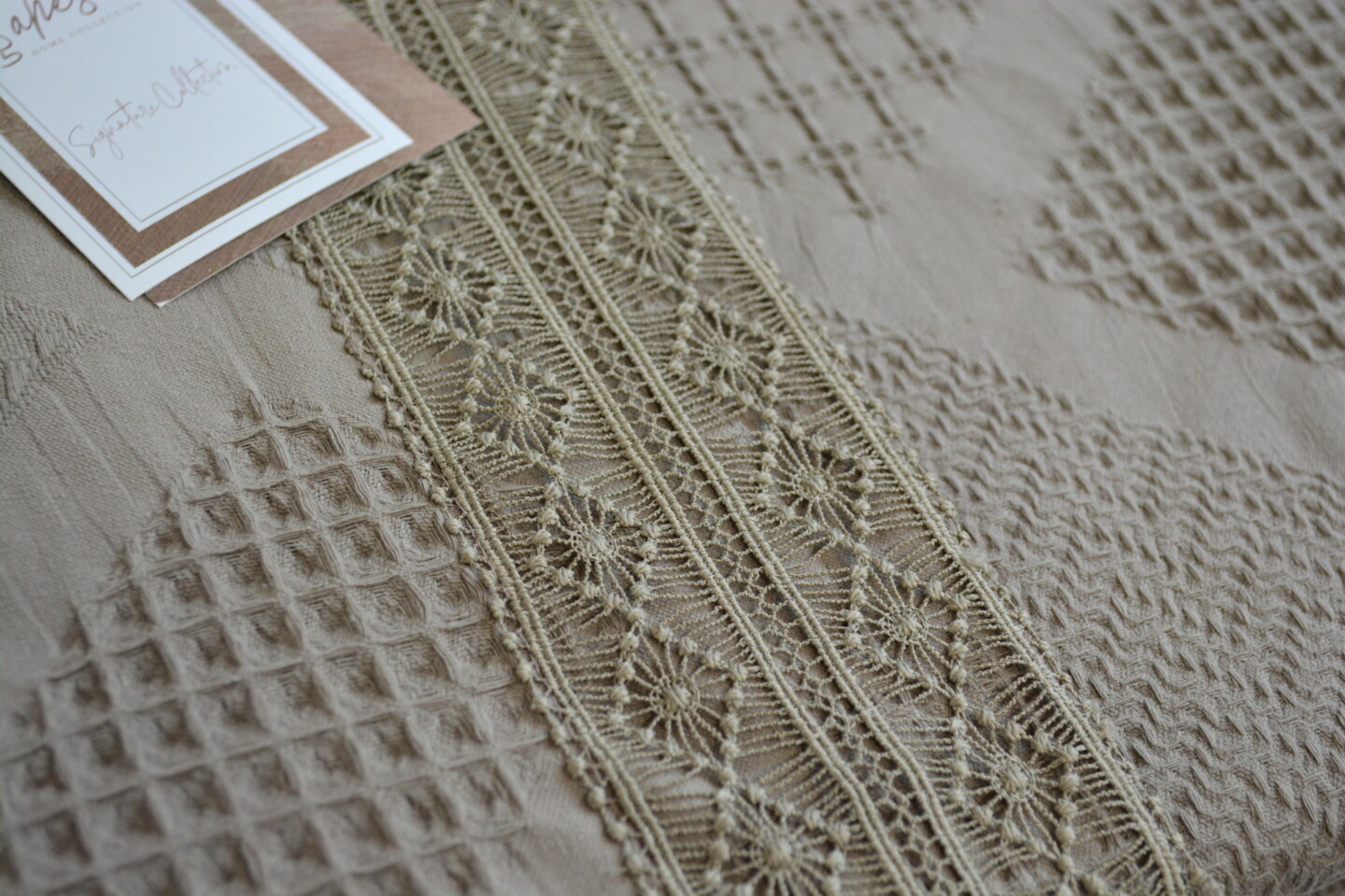 В данному комплекті покривало має вишукане жакардове плетіння. Комплект оздоблений ніжним мереживом.