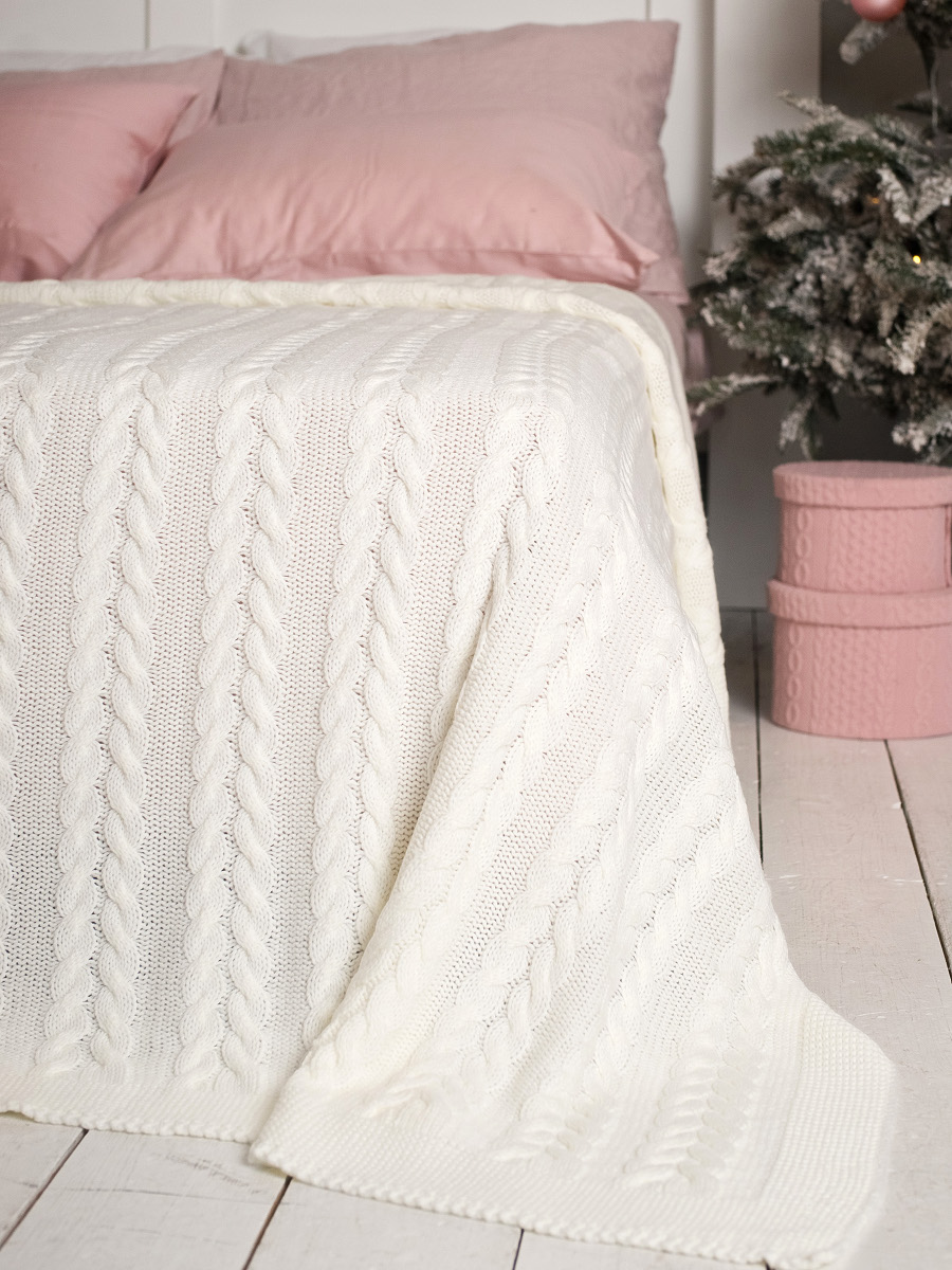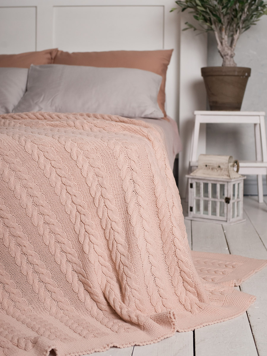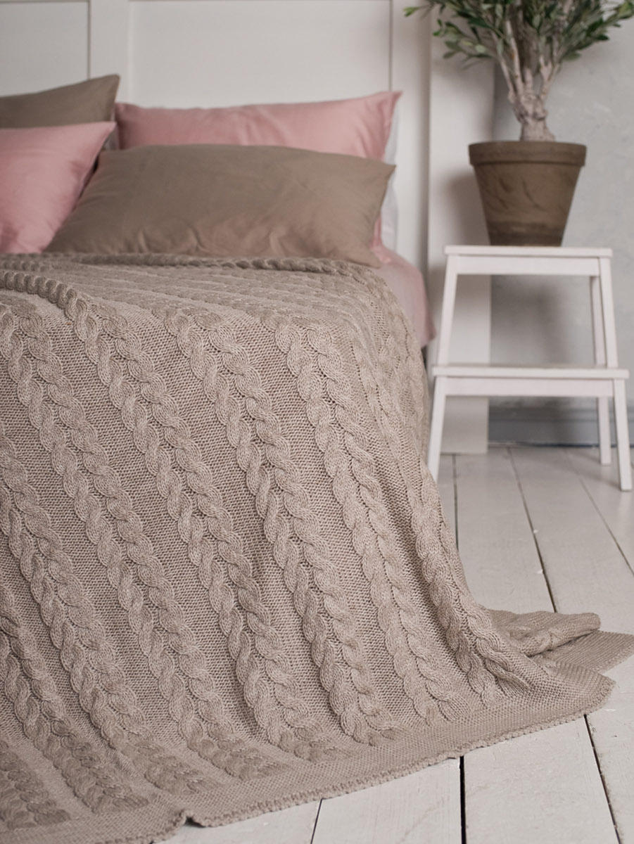 Фактурне в’язане покривало BETIRES BREMEN виготовлено з м’якої та приємної до тіла акрилової пряжі. За своїми властивостями має високу міцність і світлостійкість, а також має антибактеріальні та гіпоалергенні характеристики. Візерунок в’язання – коси по довжині полотна. По периметру покривала кант.
