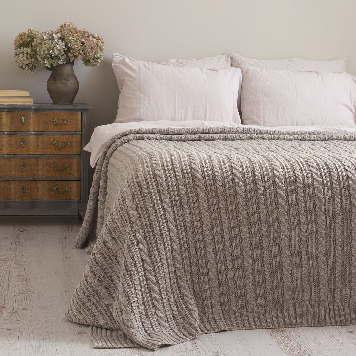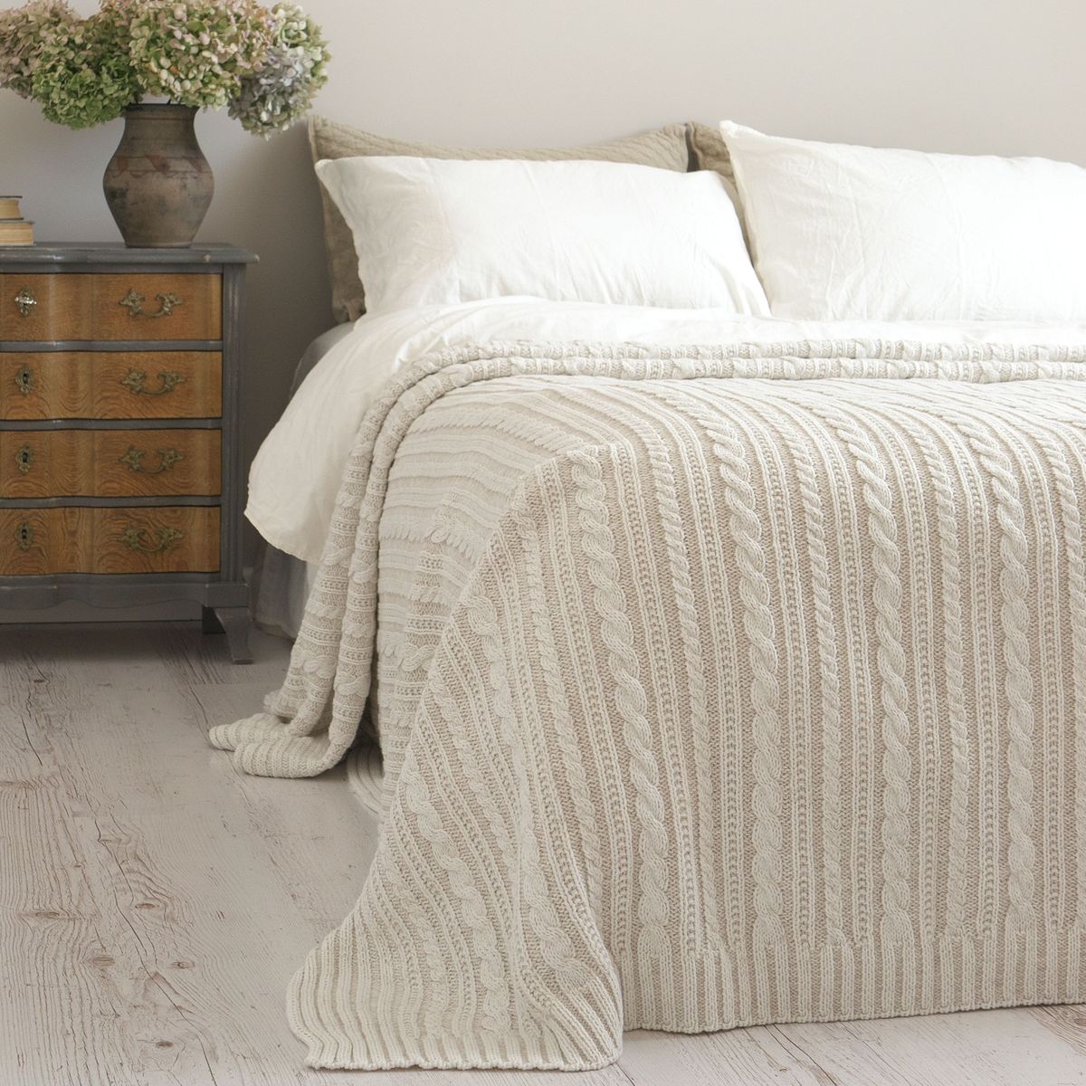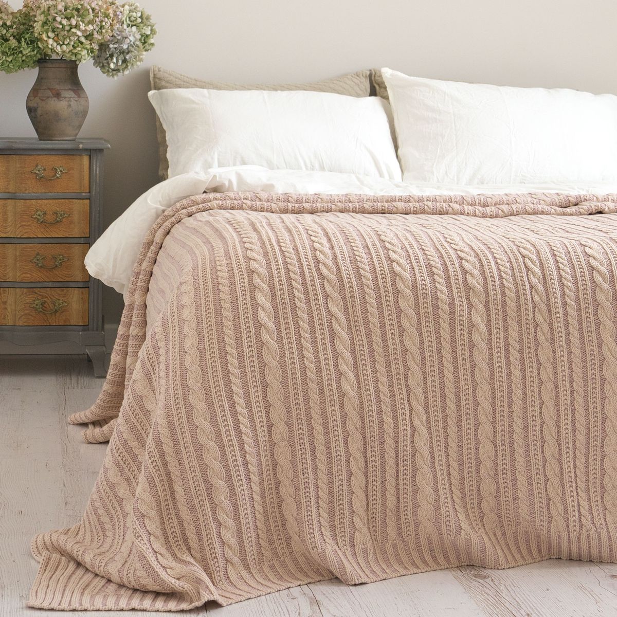 Покривало MILANIA створене з використанням з бавовняних та акрилових ниток різних кольорів та відтінків. Завдяки такому поєднанню створюється “меланжевий ефект”. Назва тканини меланж походить від французького слова melange – суміш. Меланжеві покривала виглядають колоритно, стильно та оригінально. Візерунок вʼязання коси та смужки по довжині полотна. Покривало м’яке та приємне до тіла, добре тримає форму, світлостійке та гіпоалергенне.