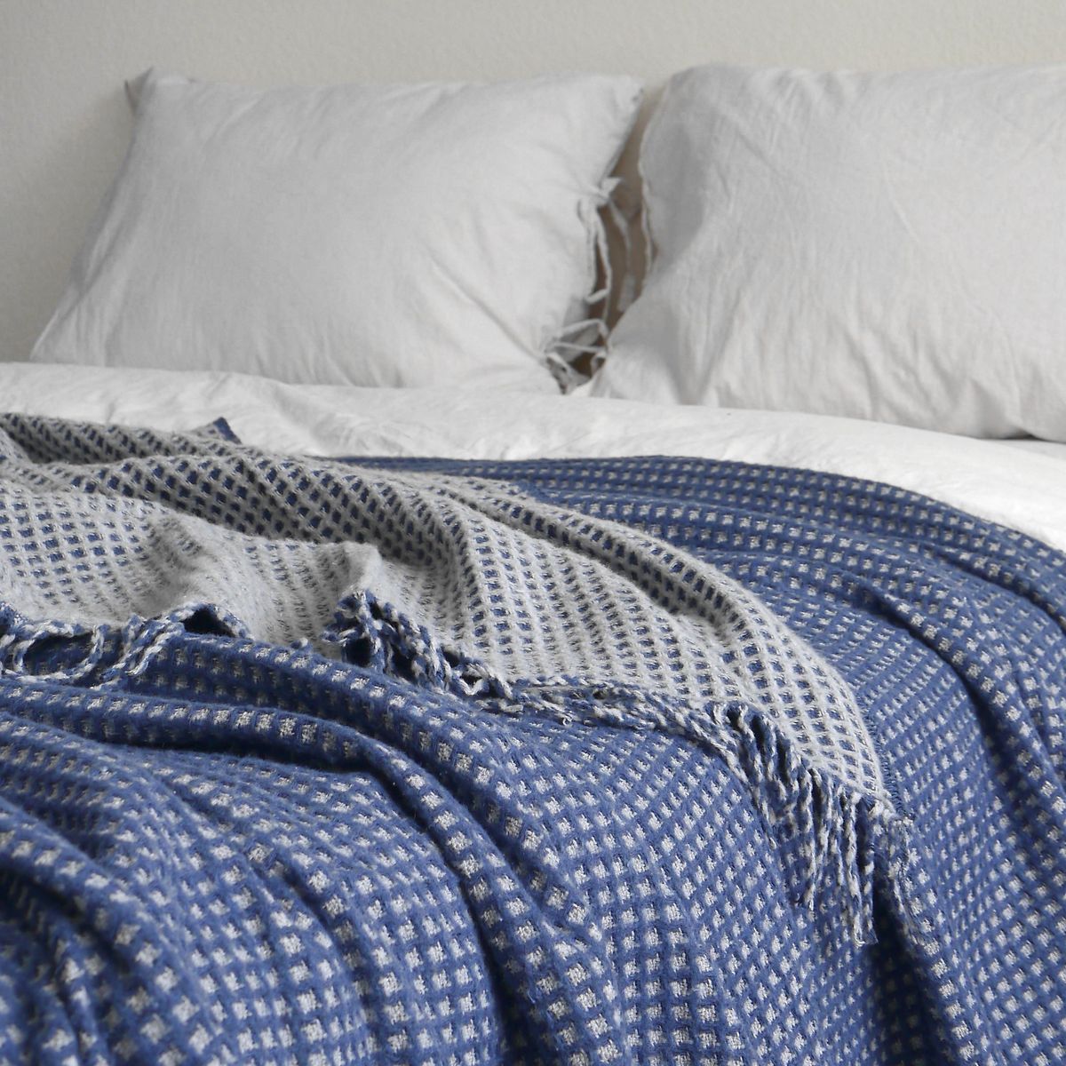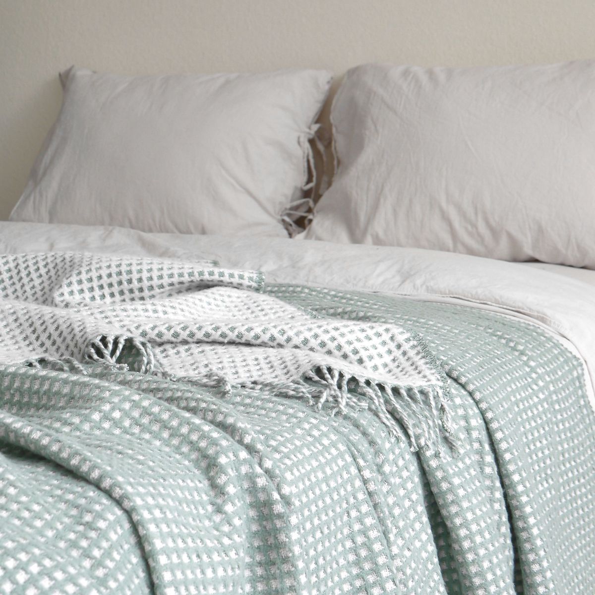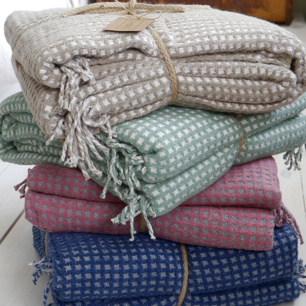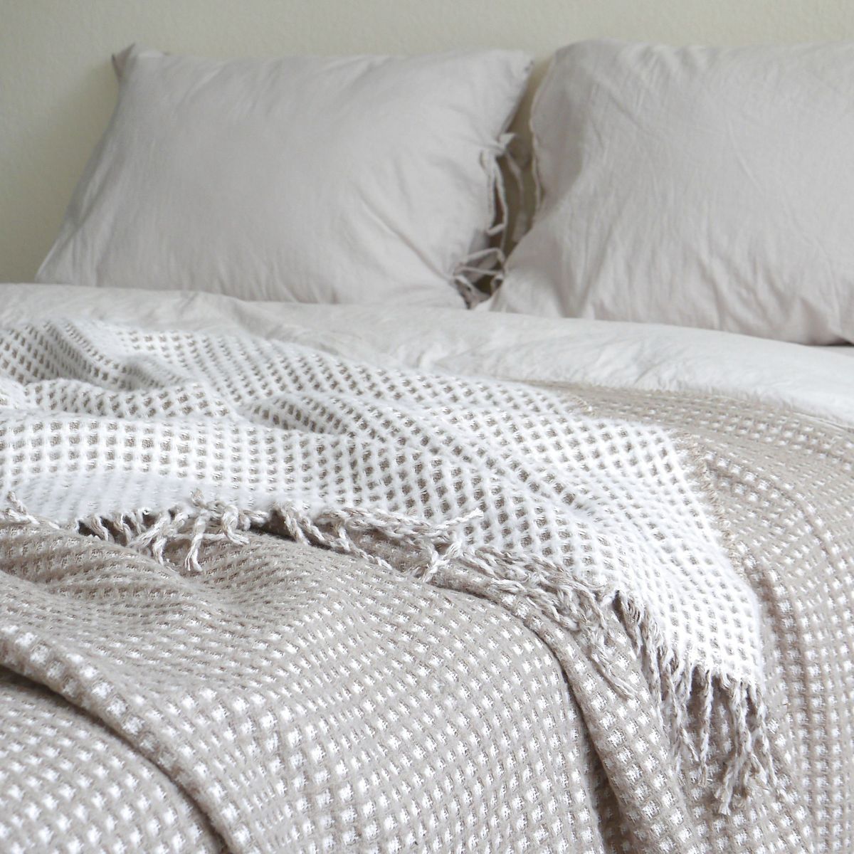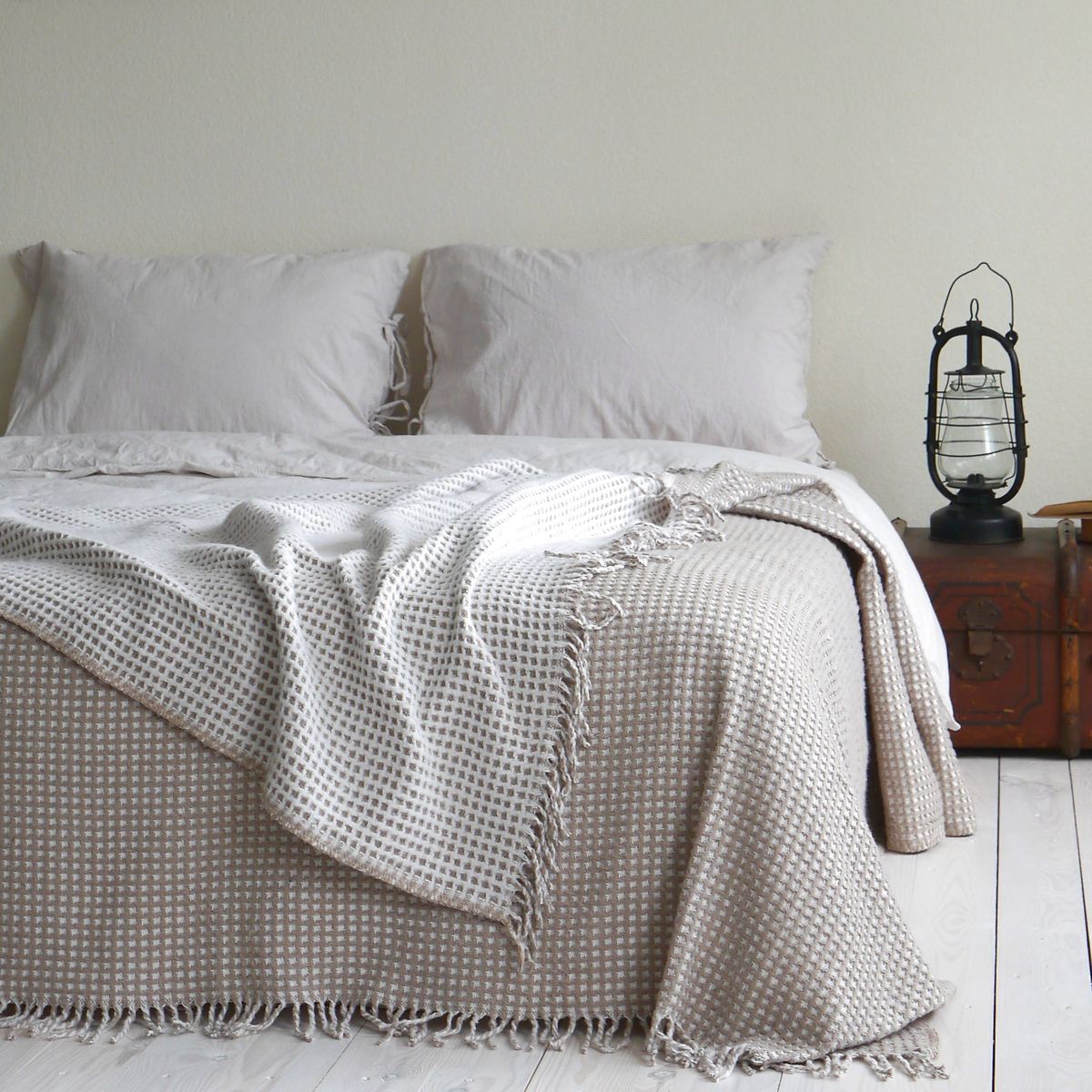 Покривало виготовлене з бавовняних та синтетичних ниток, переплетених у вигляді поперечних смужок. Покривало має гарну повітропроникність та теплопровідність, що забезпечує комфортне використання цілий рік. Покривало не електризується, не утворює ковтунців та витримує велику кількість прань без втрати кольору та форми. На дотик дуже м’яке та приємне.