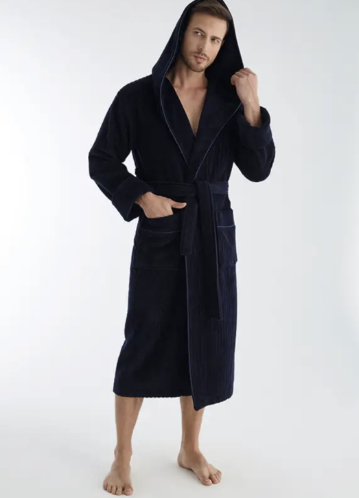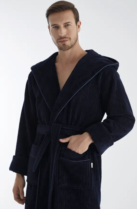 Элегантный мужской халат, невероятно нежный и мягкий на ощупь, легко и быстро впитывает влагу. Выполнен в стиле кимоно с поясом, имеет накладные карманы, средняя длина.