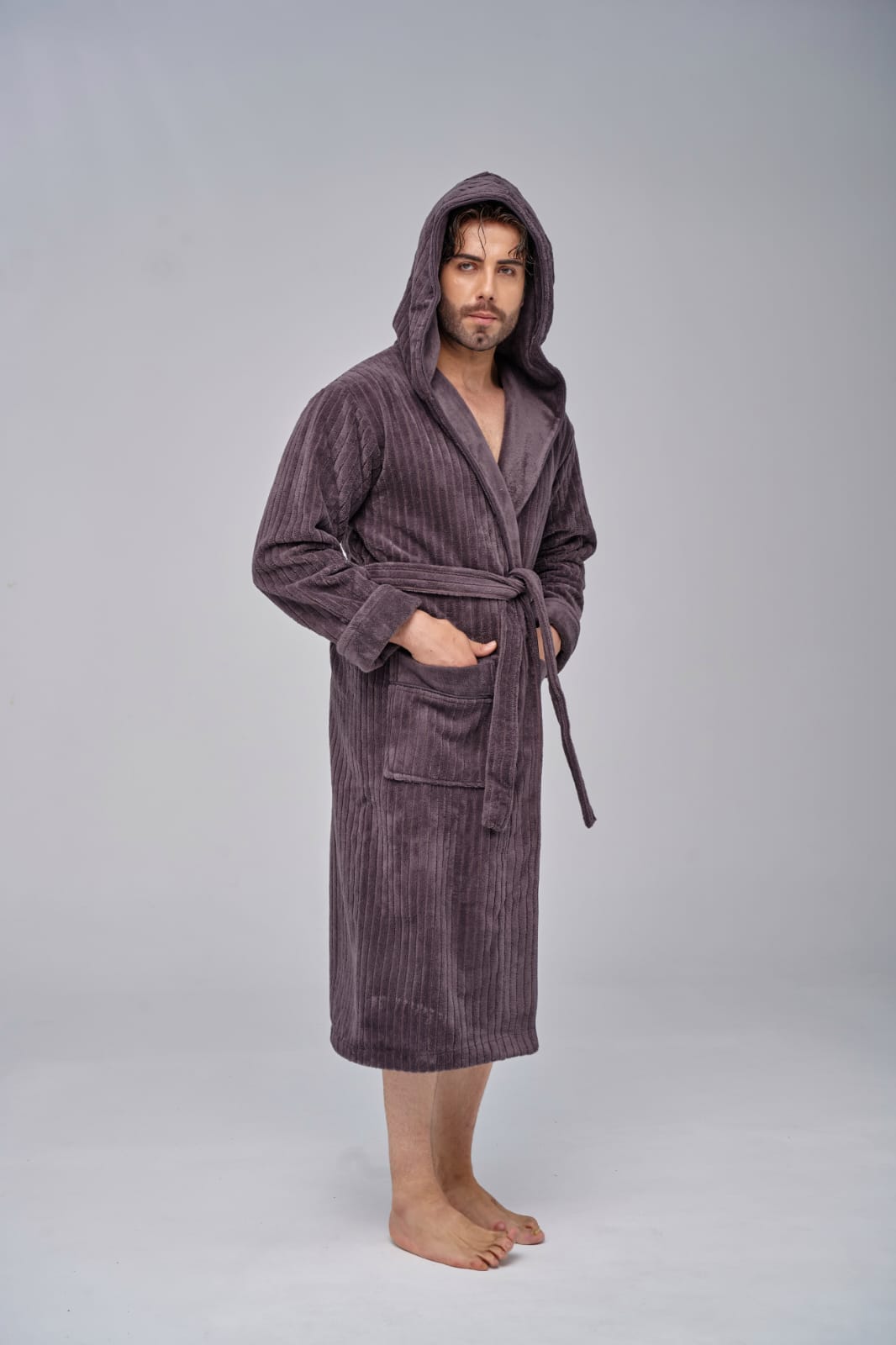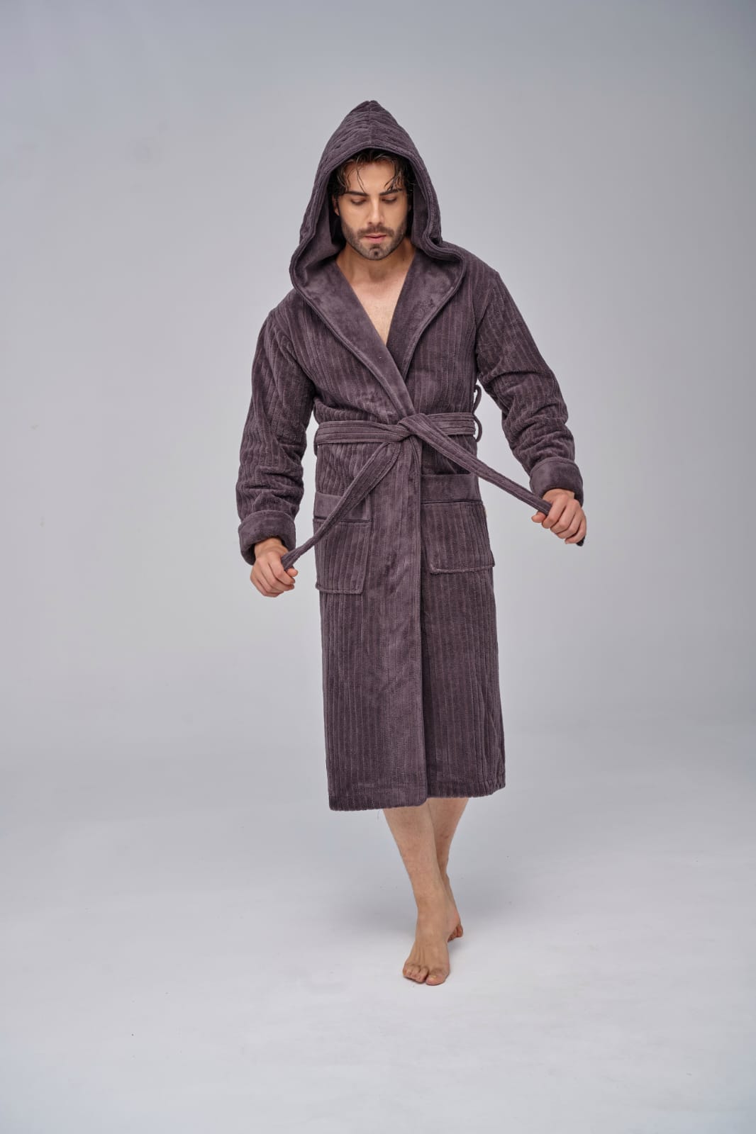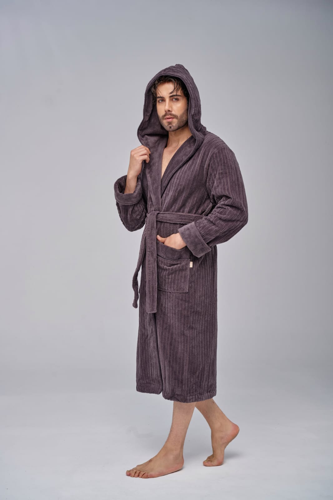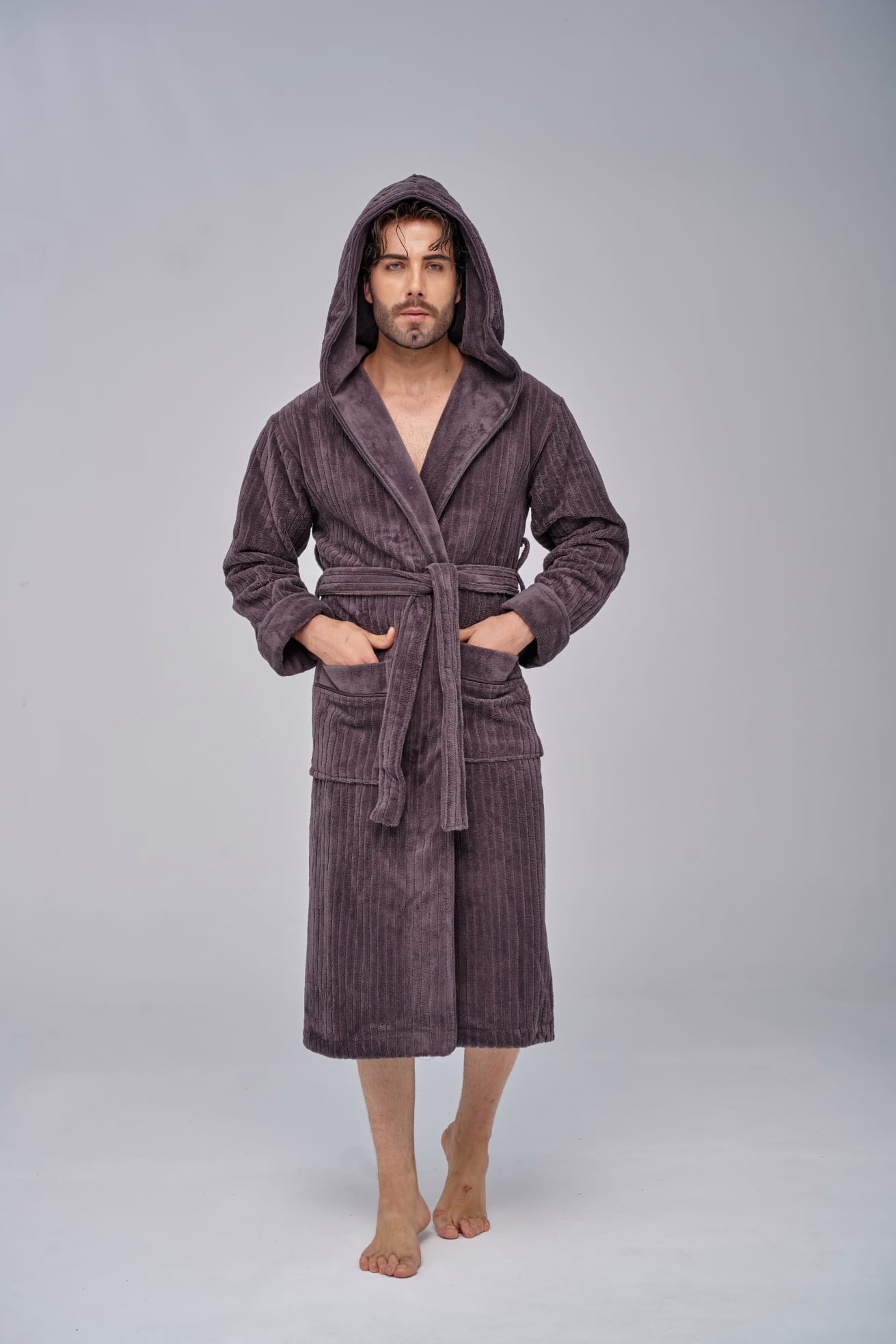 Элегантный мужской халат, невероятно нежный и мягкий на ощупь, легко и быстро впитывает влагу. Выполнен в стиле кимоно с поясом, имеет накладные карманы, средняя длина.
