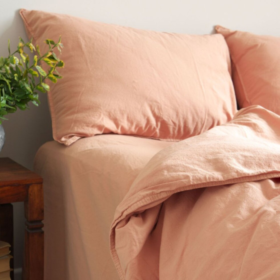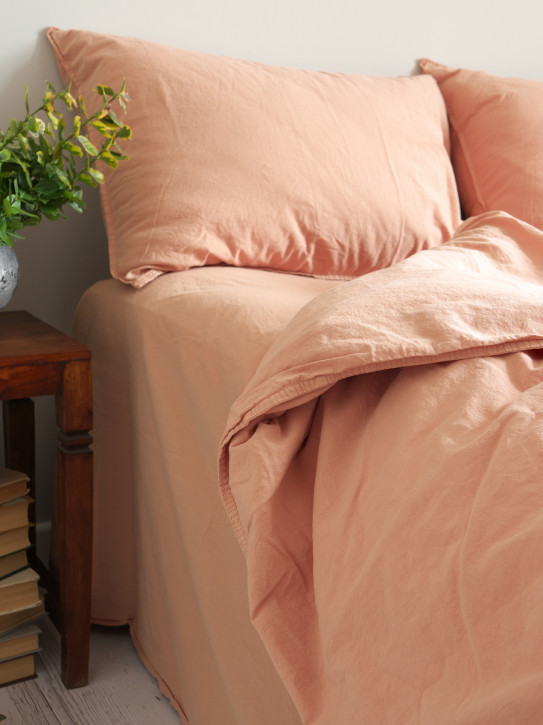 Таблица размеровПостельное белье изготовлено из однотонной хлопковой ткани, в быту более известно как “вареный хлопок”. Ткань еще на производстве подвергается значительной тепловой и влажной обработке, в результате чего происходит ее усадка с приобретением незначительного тисненого эффекта. Этот метод обработки ткани еще называют “стирка с камнями” (stone wash). Ткань крепкая и легкая, не садится, не деформируется и не нуждается в глажке. На ощупь постельное белье мягкое, нежное и воздушное, как говорится, тело в нем дышит. Минимализм красок в сочетании с роскошной фактурой – украсят и усовершенствуют ваш интерьер.