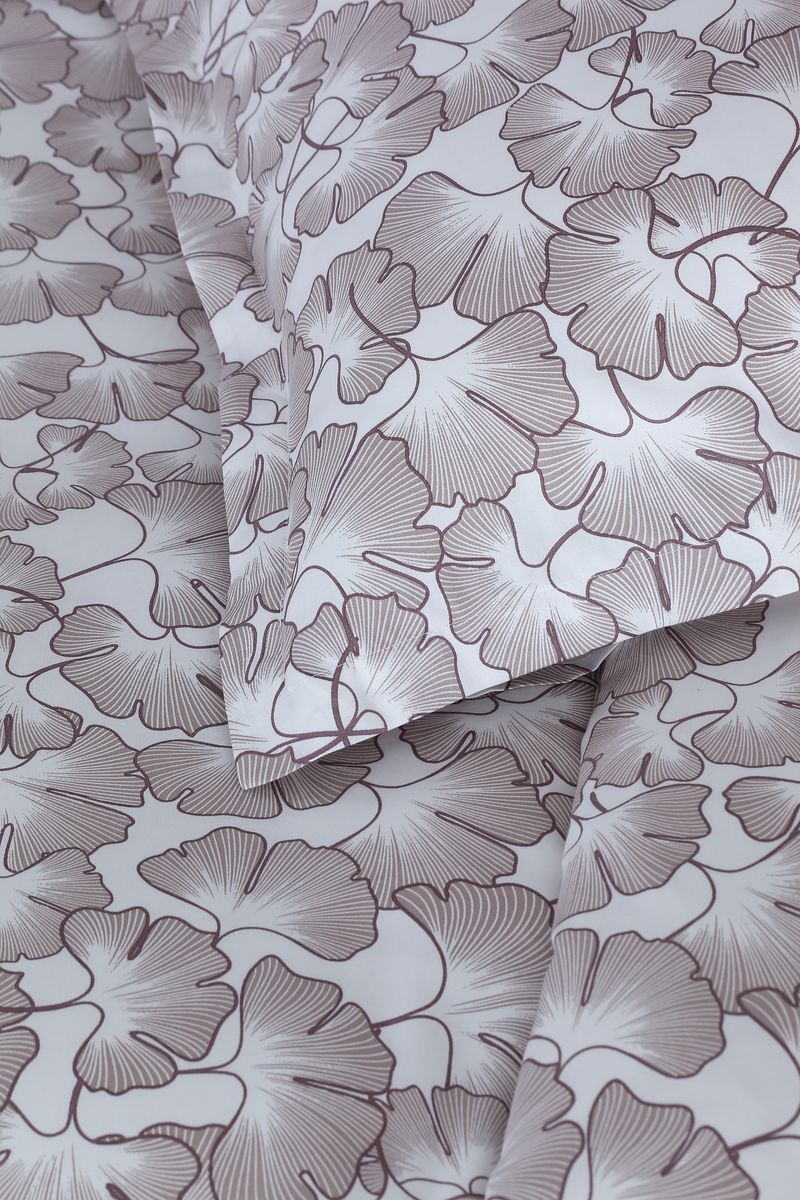 Постельное белье изготовлено из сатиновой ткани с набивным рисунком. Пододеяльник и две наволочки белого цвета украшены изысканным растительным узором в бежевых и лиловых оттенках. Нижняя часть пододеяльника застегивается на прозрачные пуговицы, что придает изделию элегантный акцент.