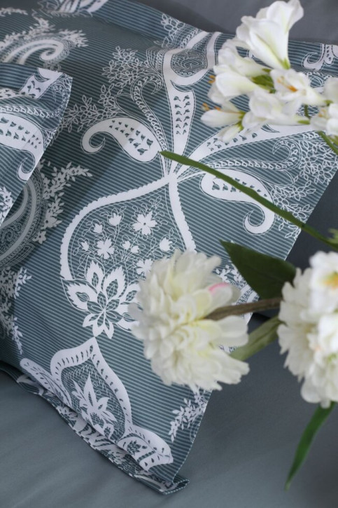 Комплект включает две наволочки с кантом, украшенные тем же узором, что и пододеяльник, и две однотонные наволочки зеленого цвета. Пододеяльник застегивается на прозрачные пуговицы, добавляя изящество и удобство.