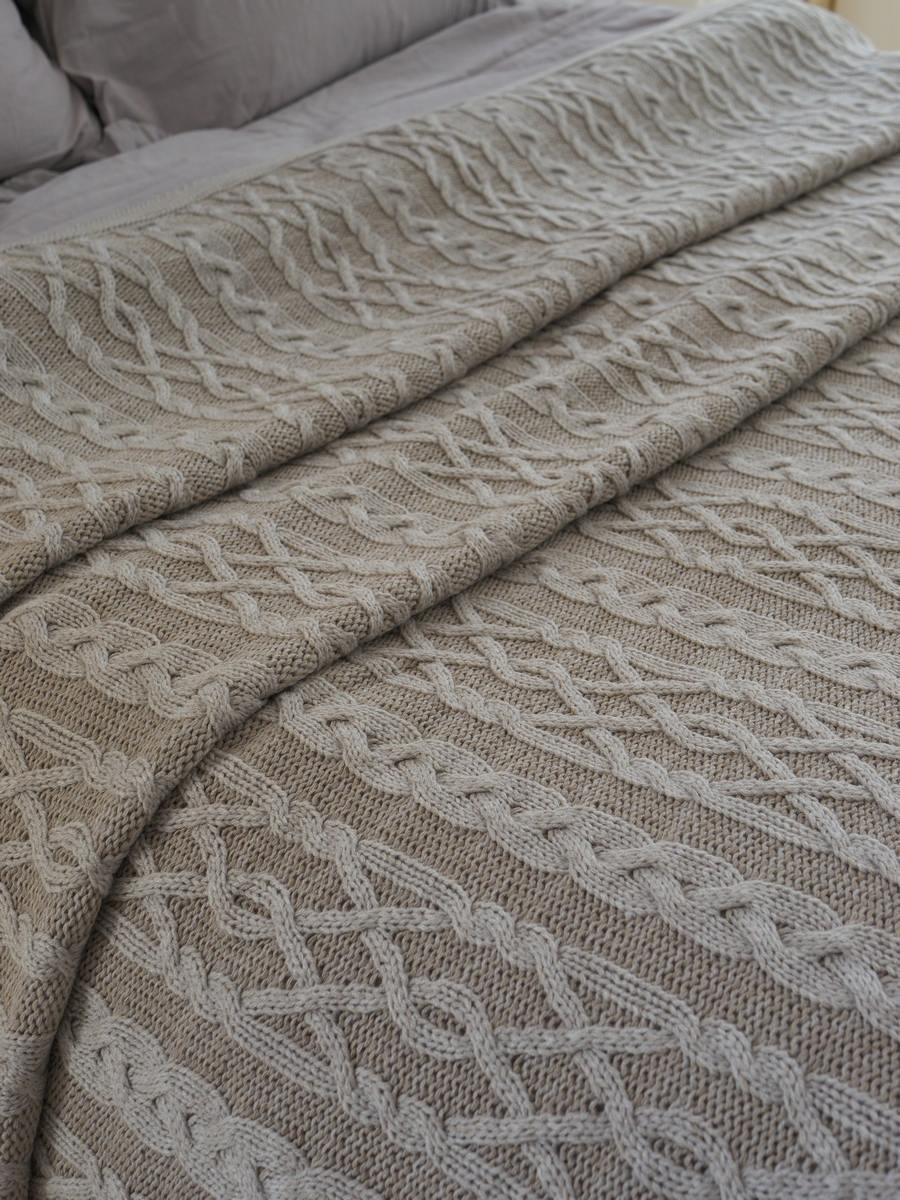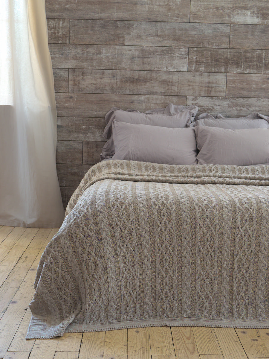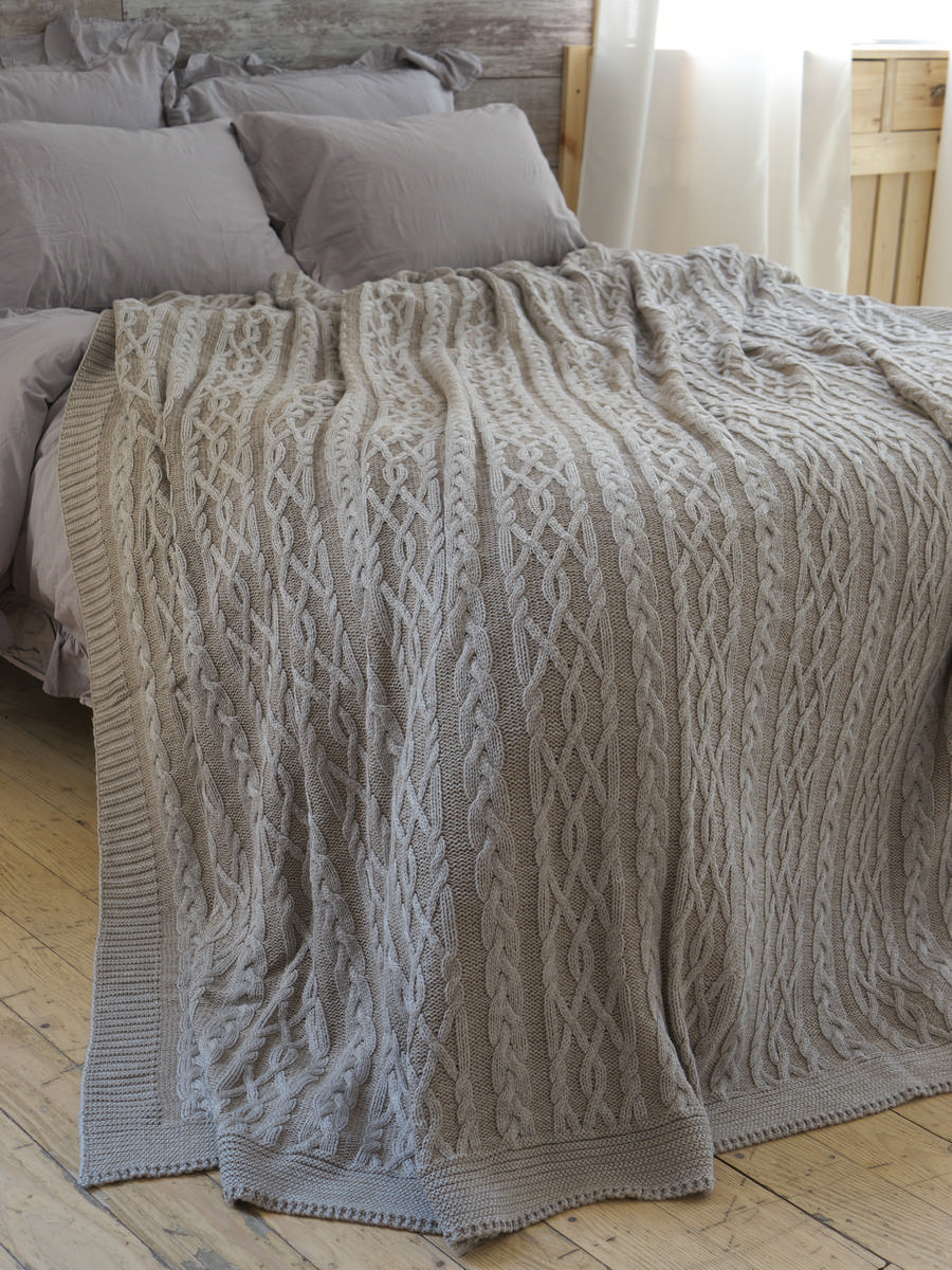 Вязаное покрывало BETIRES DOLCE. Узоры — косы. По периметру покрывала — кант. Покрывало плотное, мягкое и приятное на ощупь. Обладает высокой прочностью и светостойкостью, а также антибактериальными и гипоаллергенными свойствами.