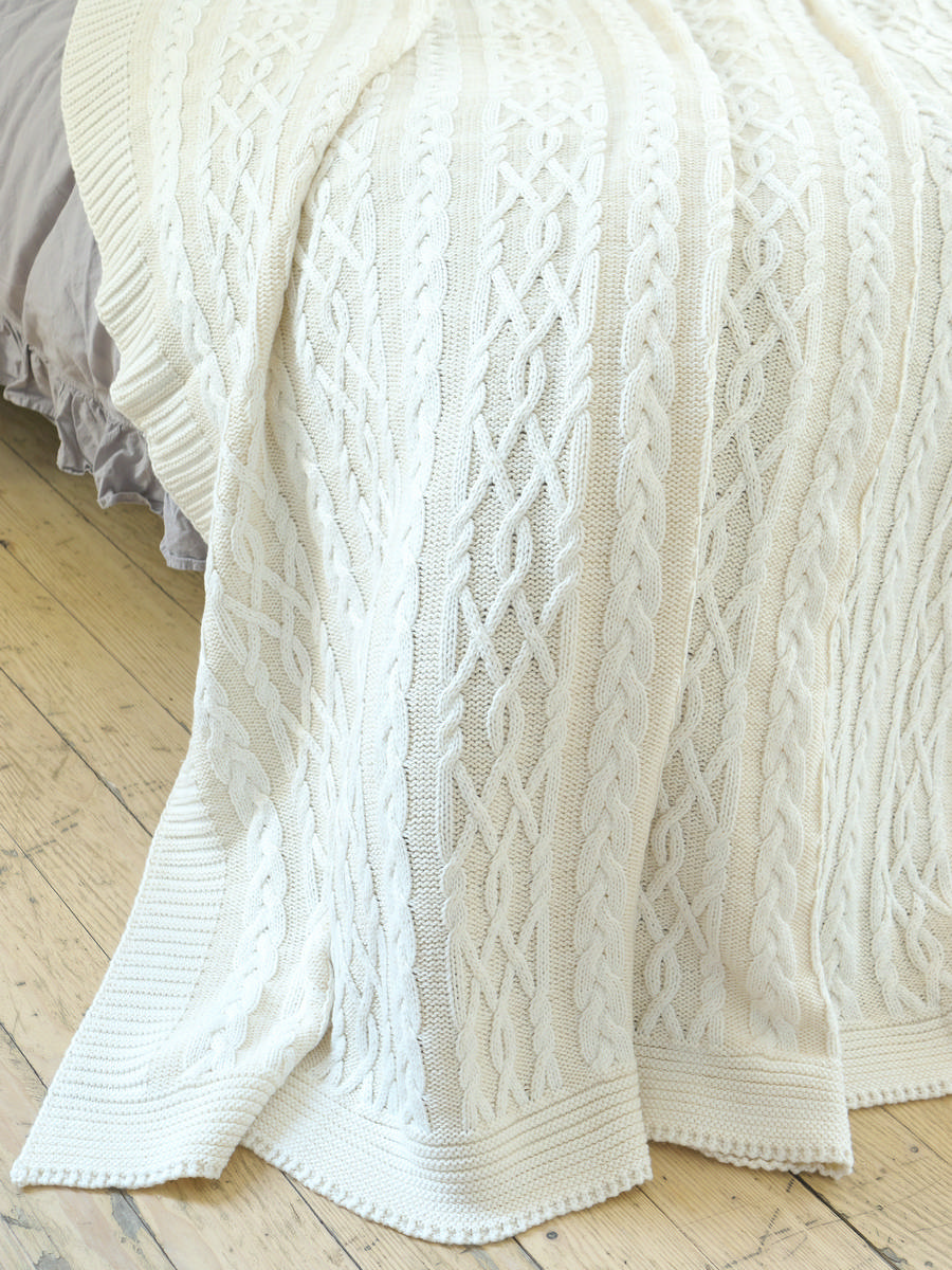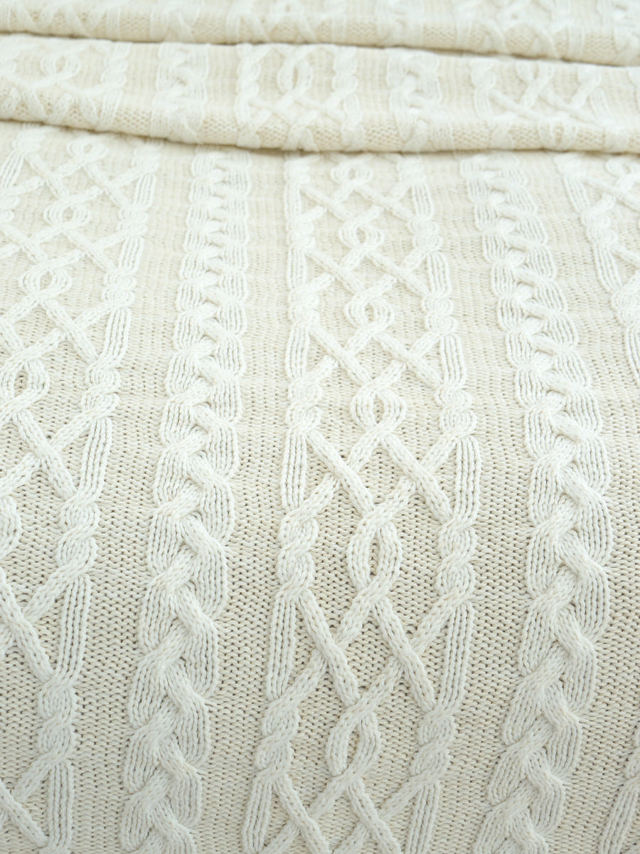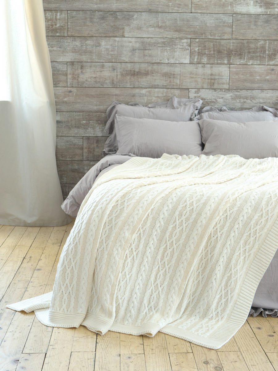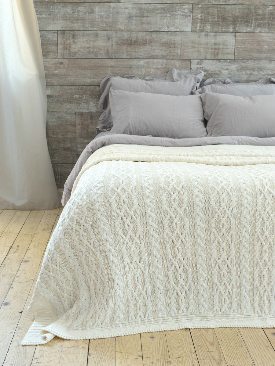 Вязаное покрывало BETIRES DOLCE. Узоры — косы. По периметру покрывала — кант. Покрывало плотное, мягкое и приятное на ощупь. Обладает высокой прочностью и светостойкостью, а также антибактериальными и гипоаллергенными свойствами.